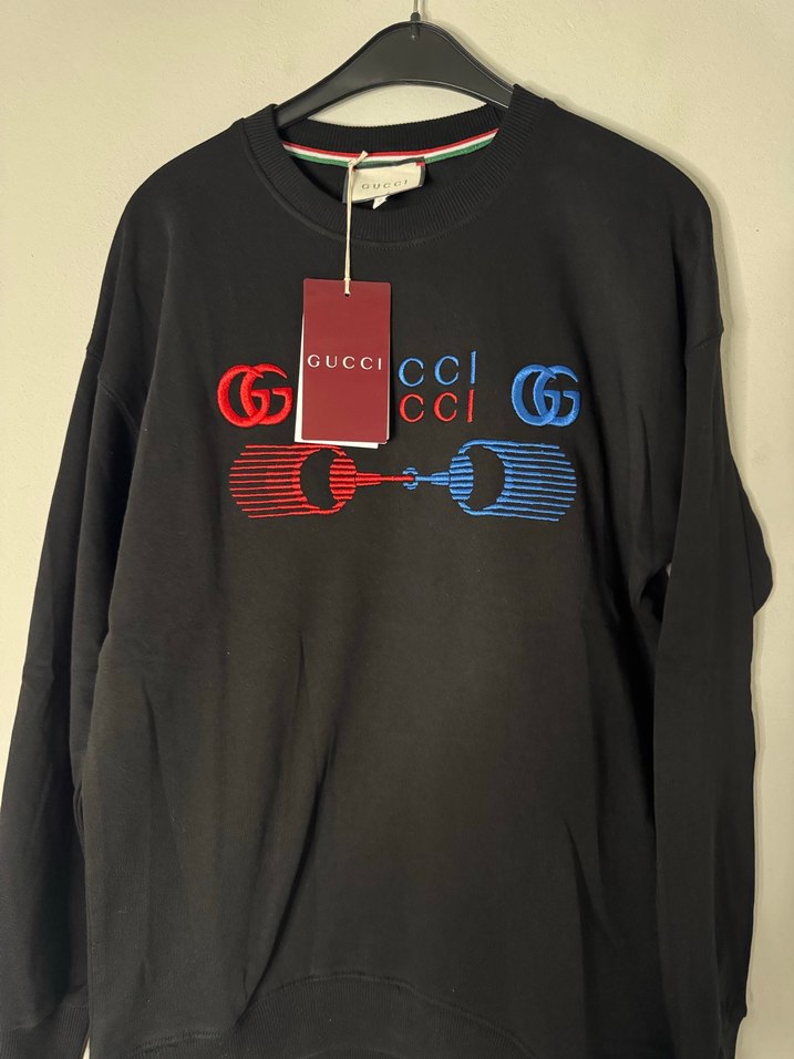 Siyah renkli, uzun kollu ve bisiklet yaka Gucci sweatshirt. Örme, yumuşak ve kalın kumaştan, baskılı kırmızı ve mavi desenli, rahat kesim.