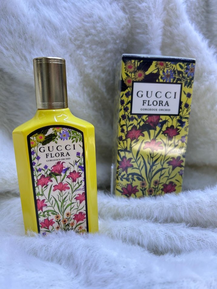 Gucci Flora Gorgeous Orchid kadın parfümü, çiçeksi kokusuyla canlı sarı şişede ve şık ambalajda sunuluyor.