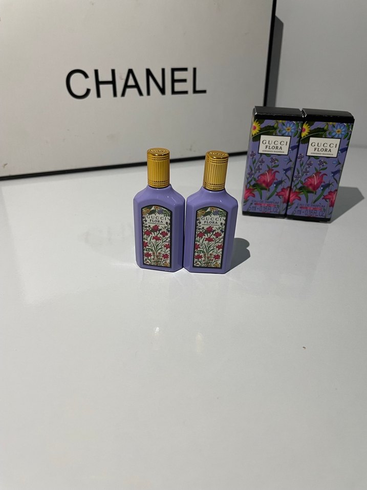İki adet Gucci Flora kadın parfümü, mor şişede çiçek desenli ve altın kapaklıdır. Kutusu renkli çiçek illüstrasyonları içerir.