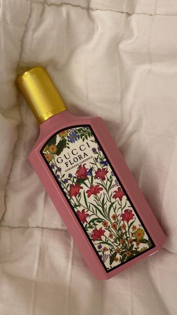 Gucci Flora Gorgeous Gardenia kadın parfümü, pembe şişede çiçek desenli ve altın kapaklı. Zarif ve ferah kokulu. BÜYÜK BOY 600 ÇANTA BOY 200