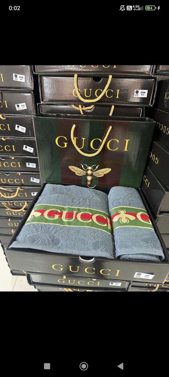 Gucci logolu ve arı desenli gri tonlarda baskılı havlu seti. Yumuşak dokulu, counterculture tarzda şık ambalajda sunulur.