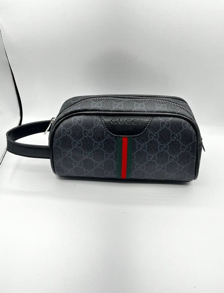 Gucci gri yılan desenli erkek omuz çantası, fermuarlı ve şık iş stiliyle dikkat çekiyor.