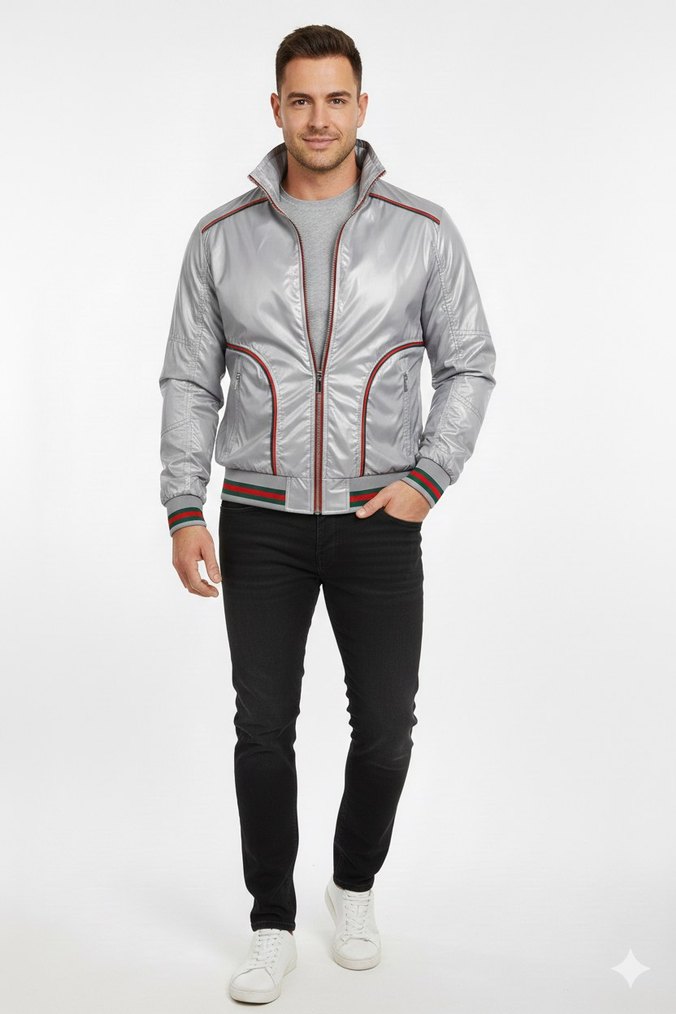 Gri metalik görünümlü, fermuarlı ve notalı yaka detaylı erkek ceket. Uzun kollu, normal kesim ve midi boyda, kırmızı serit çizgiler bulunur cep stiliyle ile sırt logu günlük rahat kullanıma uygun. Bedenleri mevcuttur