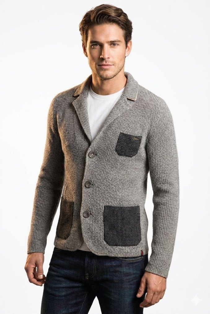 Gri örgü yün ceketin yakası notched lapel ve uzun kolludur. Regular fit ve normal boyda, iki koyu renk cepli günlük kullanıma uygundur. İtal sıfır bir üründür L beden dir