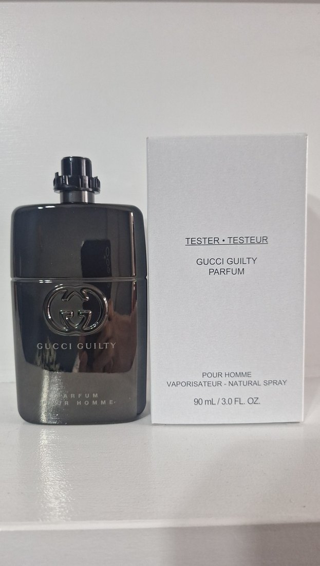 90 ml doğal sprey Gucci Guilty erkek parfümü, şık gri şişede.
