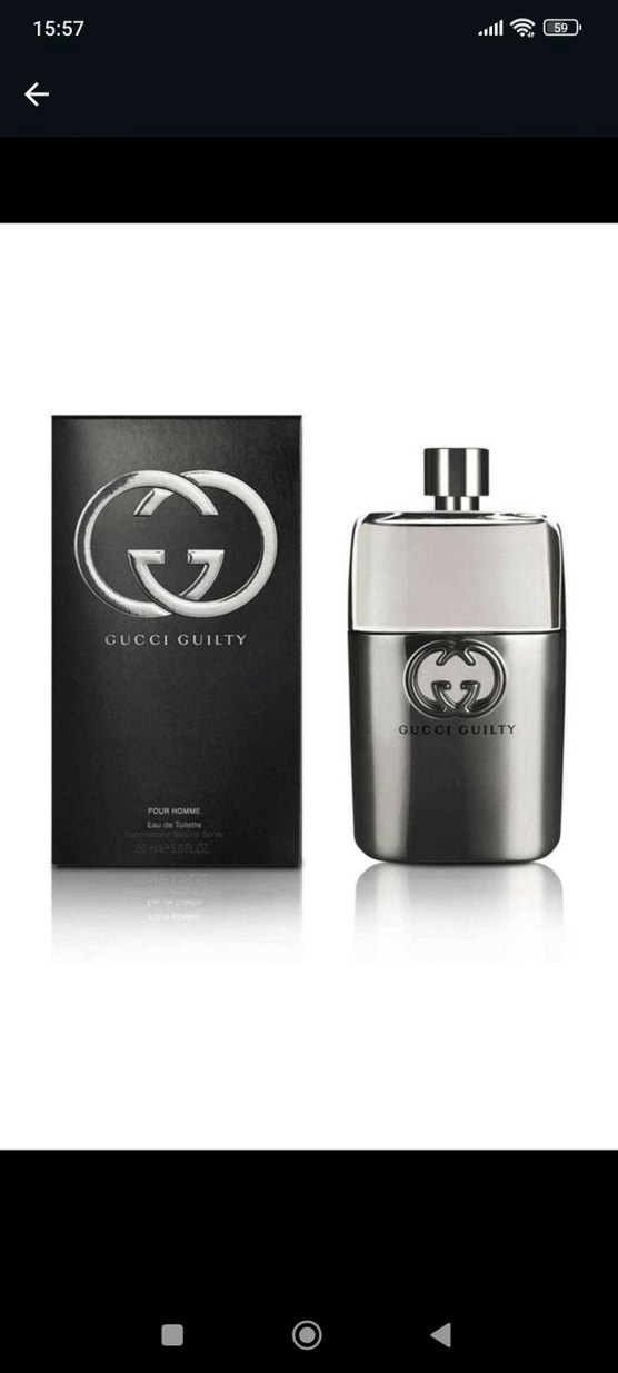 Gucci Guilty erkek parfümü, minimalist tarzı yansıtan çağdaş ve gri şişeye sahiptir. Şık kutusunda Gucci logosu bulunur.
