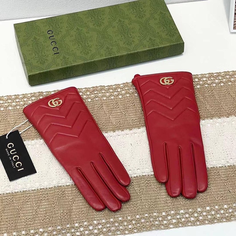 Gucci imzalı kırmızı deri eldivenler, pileli detaylara ve klasik şıklıkla birleşen çağdaş bir tasarıma sahiptir. Rahat ve şık bir görünüm sunar.