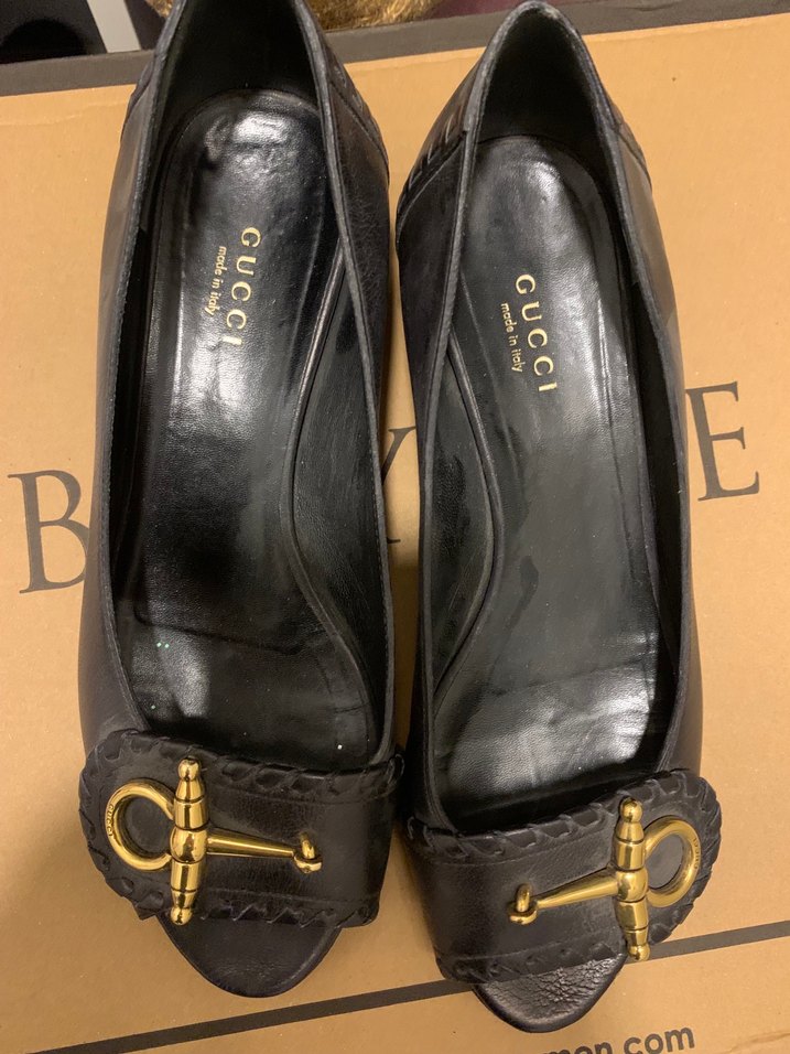 Gucci marka, orjinal. deri malzemeden yapılmış, tokalı ve kalın topuklu kadın klasik şık ayakkabılar. Ofis kullanımı için uygundur.