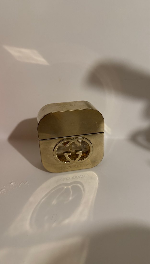 İkonik Gucci logosu bulunan metalik altın kaplamalı Gucci kadın parfümü. Kompakt tasarımı taşıması kolaydır. Lüks görünümlü parfüm şişesi.