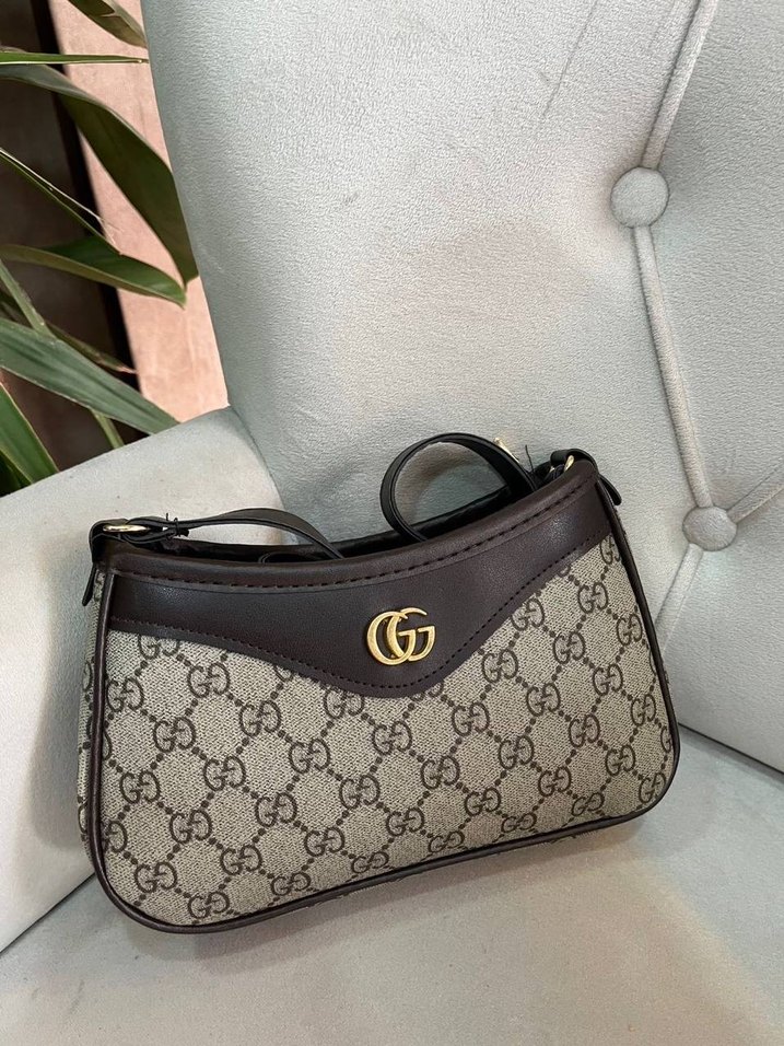 Kahverengi deri tokalı kadın çanta, gri tonlu baskı ve çift G logosu ile modern klasik tarzı günlük kullanıma sunar.