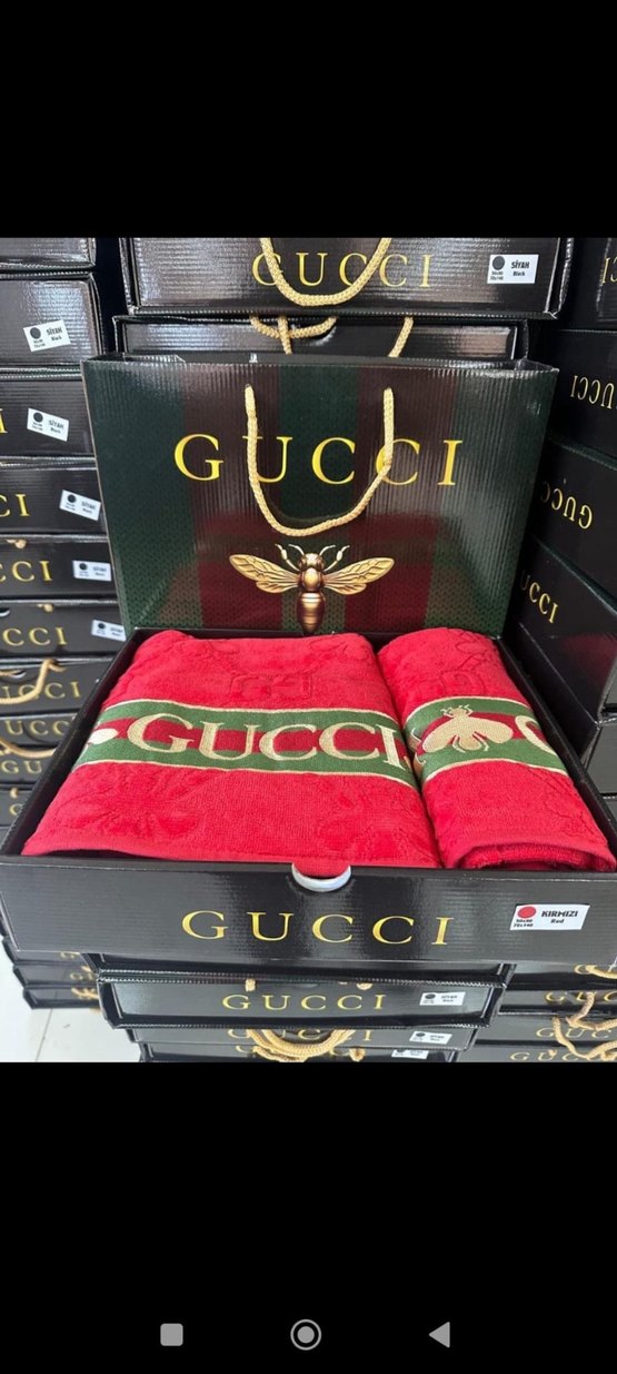 Gucci marka, renkli ve bohem tarzda kırmızı desenli havlu seti, şık ve canlı bir tasarıma sahiptir.