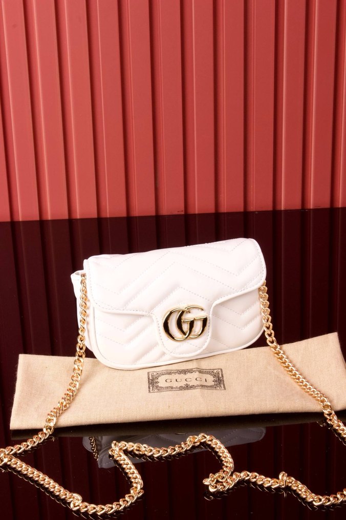 Beyaz deri, baskılı desenli ve tokalı tasarıma sahip kadın çantası. Altın renk zincir askısıyla modern klasik tarzı günlük kullanıma uygun. Gucci Marmont mini shoulder