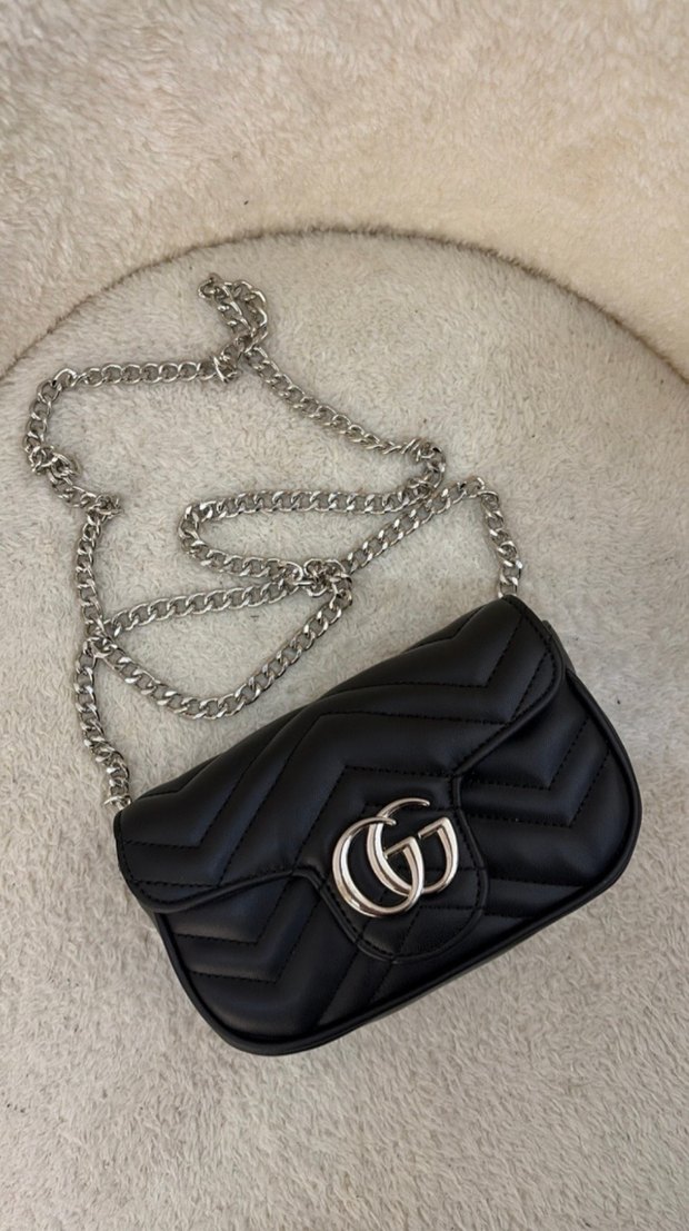 Siyah deri kadın çanta, kapitone dikişli ve çift G logolu, gümüş zincir askılı trendy bir tasarıma sahiptir. İthal üründür ve kaliteli bir deriye sahiptir. Gucci poşeti ile gönderim yapılır.