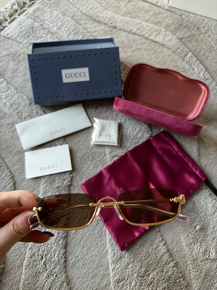 Gucci marka, parlak altın çerçeveli, koyu renk camlı kadın güneş gözlüğü. Klasik şıklık ve sokak modası tarzını birleştirir. Kılıf ve torba dahil.