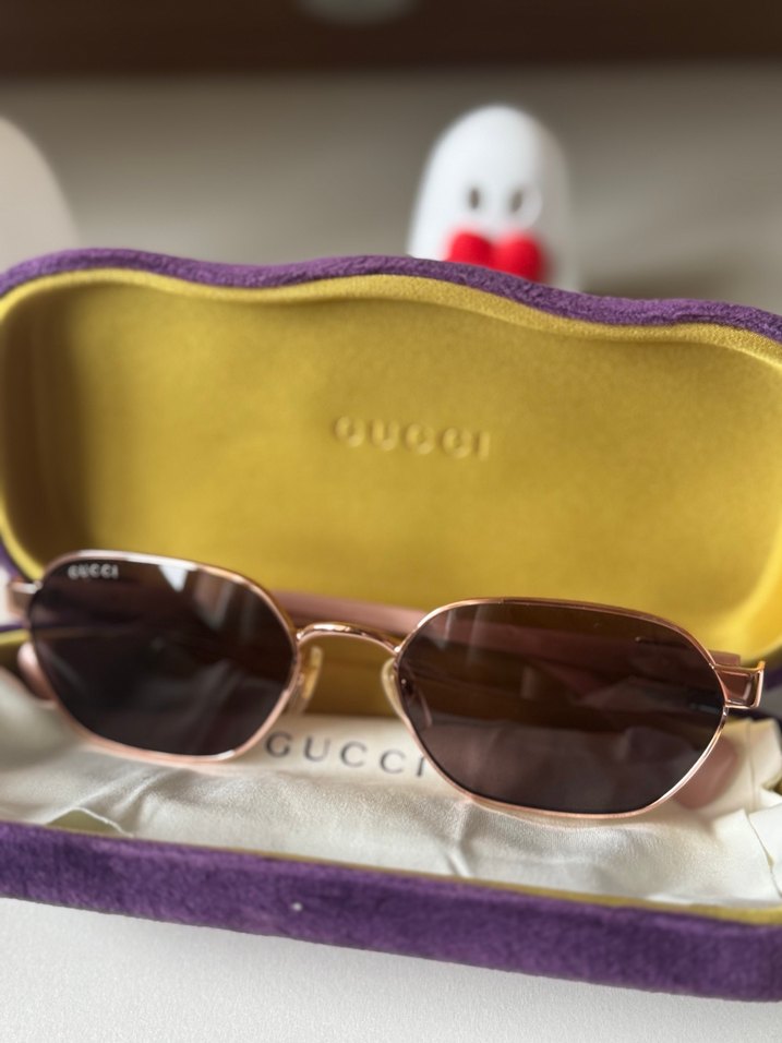 Gucci markalı, parlak altın çerçeveli kahverengi lensli kadın güneş gözlüğü. Klasik zarafet ve karşı kültür stilini yansıtır, kadife kutu ile. Cizik veya defosu yok