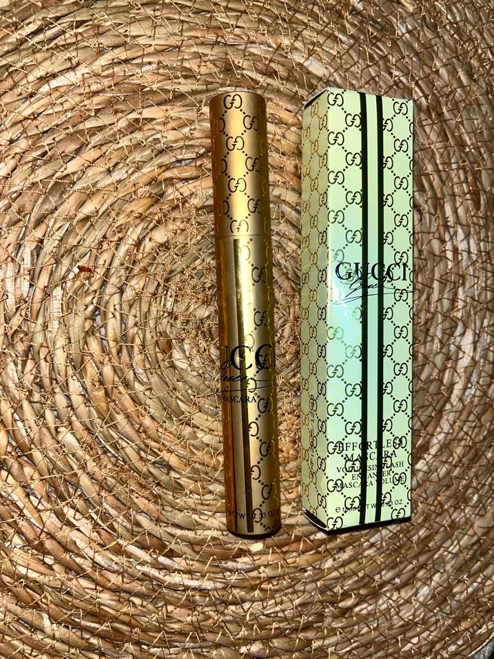 Gucci markasına ait parlak altın renkli maskara, lüks dokunuşla kirpikleri belirginleştirir. ✨