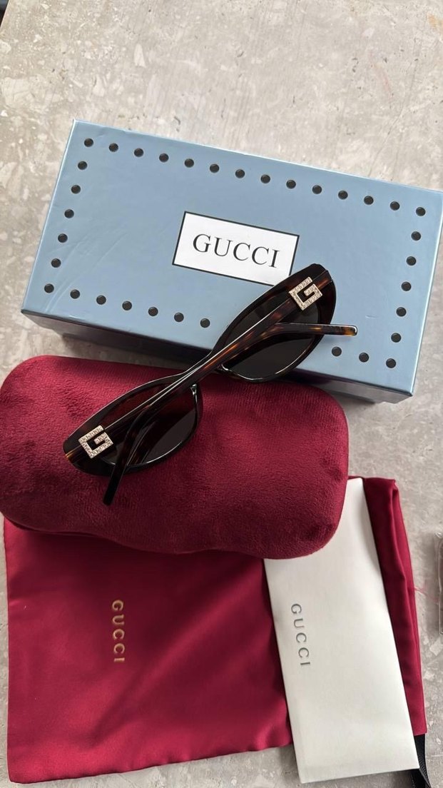 Gucci markalı, parlak kahverengi çerçeveli, koyu renkli lenslere sahip klasik zarafet ve karşı kültür tarzını yansıtan kadın güneş gözlüğü. ️