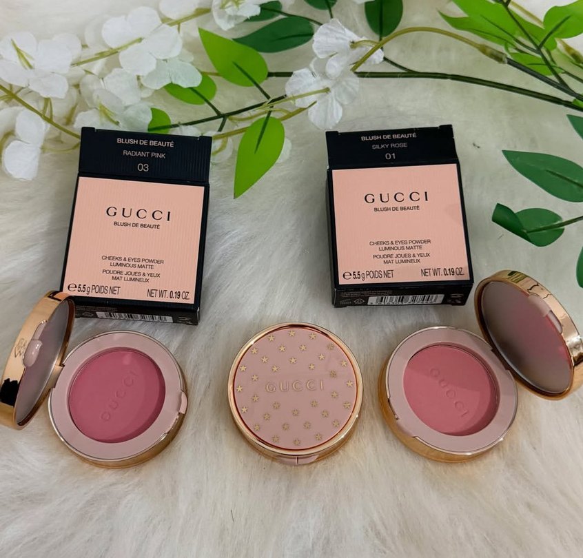 Gucci'nin pastel pembe tonlarında, yanak ve gözler için mat parlaklık sağlayan allıkları. Her kutu kapağında yıldız desenleri bulunur.