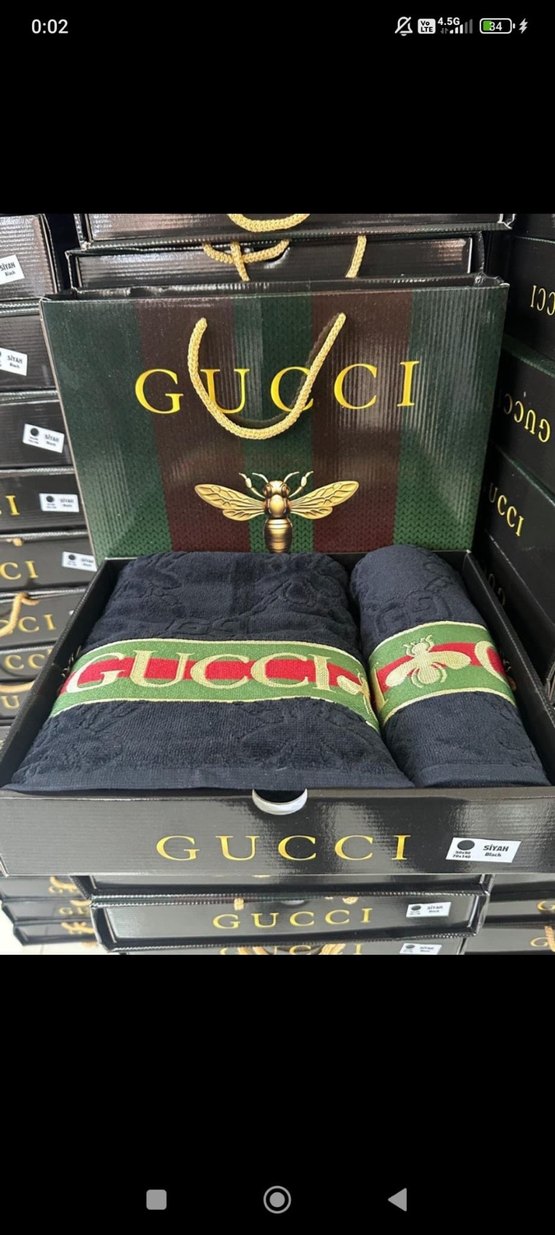 Siyah renkte, bohem desenli ve Gucci marka baskılı iki havlu seti. Zarif arı figürleriyle dikkat çekiyor.
