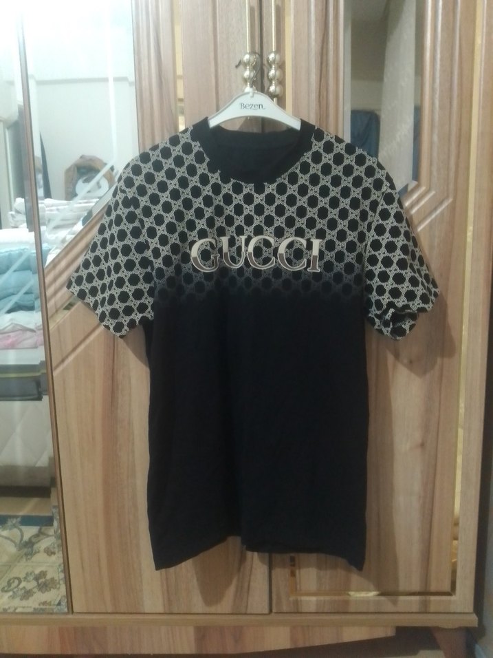 Siyah renkli, pamuklu kumaştan üretilmiş, gevşek kesim, kısa kollu, bisiklet yaka erkek tişört. Üst kısmında desenli örgü ve Gucci logosu bulunur. 1 kez giyildi defosu vs yoktur temiz kullanılmıştir
