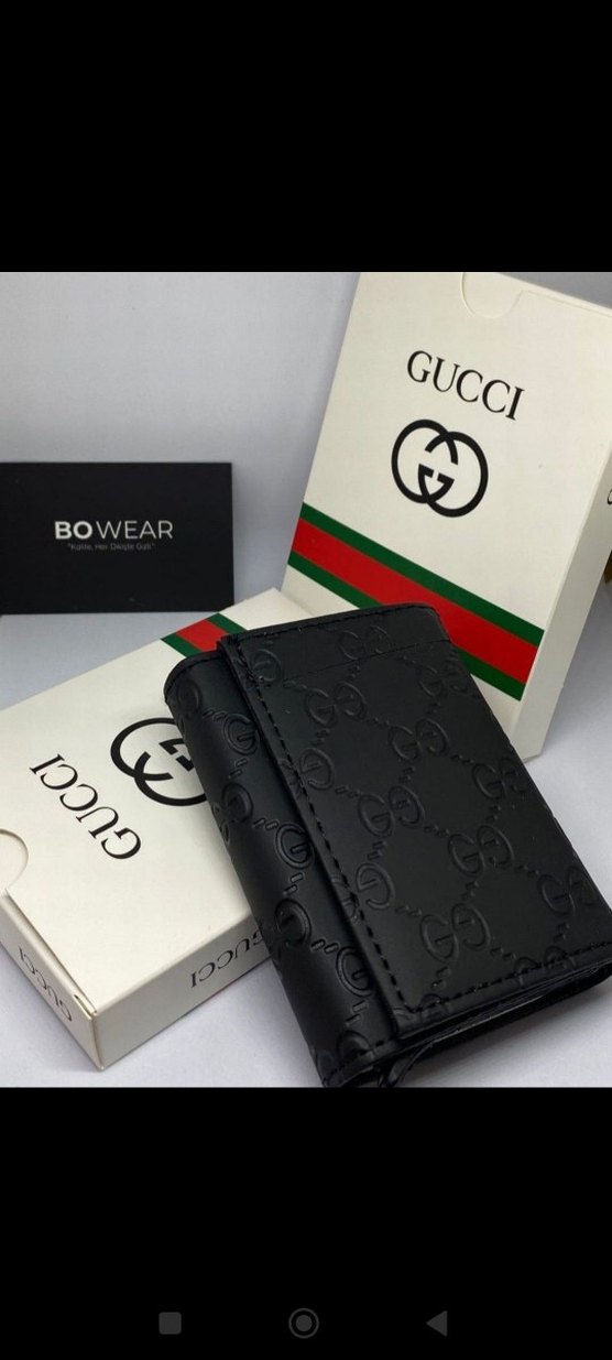 Kabartmalı Gucci logosu desenli siyah erkek cüzdanı, klasik şıklığı sokak tarzıyla birleştirir. BOWEAR ve Gucci markalıdır.