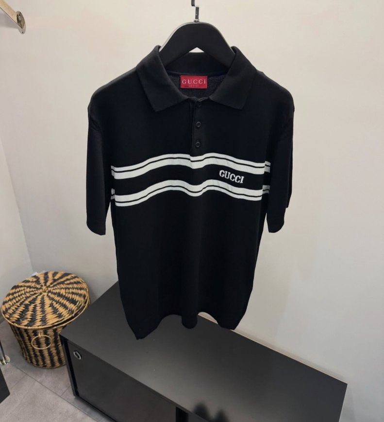 Siyah pamuklu erkek polo tişört, kısa kollu, rahat kesim ve yuvarlak yaka. Örme kumaştan, GUCCI baskılı ve beyaz çizgili, günlük rahat stil için uygun.