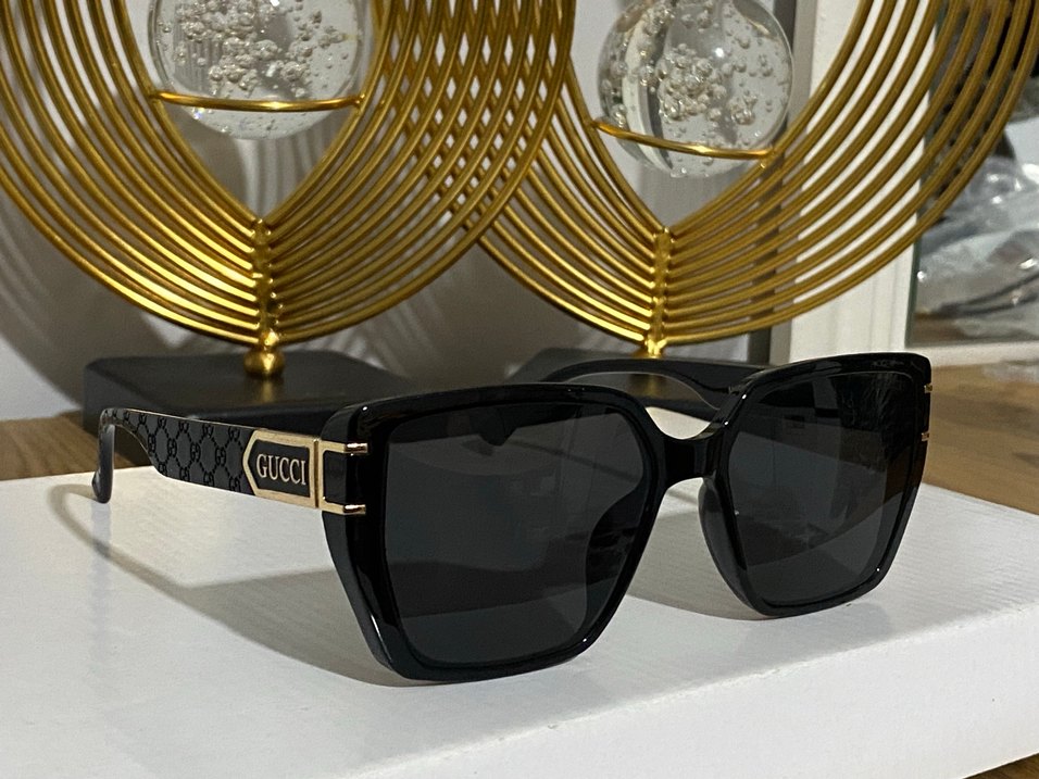 Klasik kare çerçeveli, parlak siyah Gucci güneş gözlüğü, koyu renk camlı ve yanlarında marka logosu bulunan model. ️