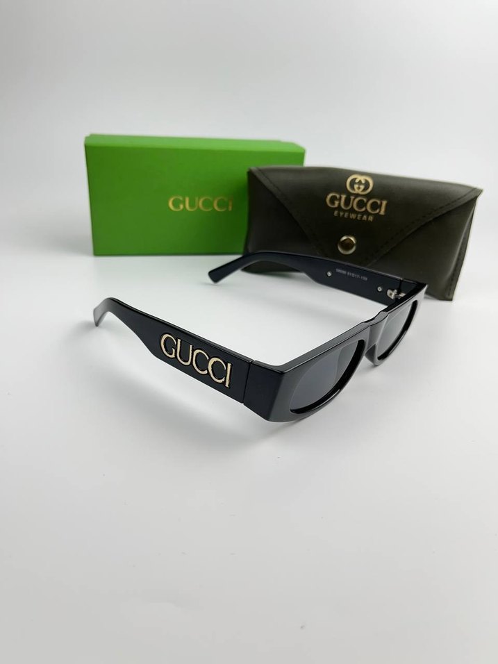 Parlak siyah Gucci kadın güneş gözlüğü, klasik sokak modası tarzında, belirgin logo detaylarıyla. Markalı kutu ve kılıf ile birlikte. ️