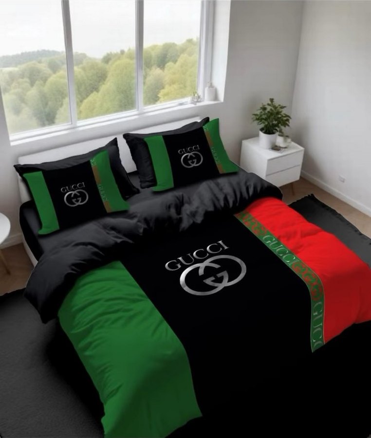 Gucci baskılı, koyu yeşil ve siyah renkli nevresim takımı, uyumlu yastık kılıfları ile birlikte.