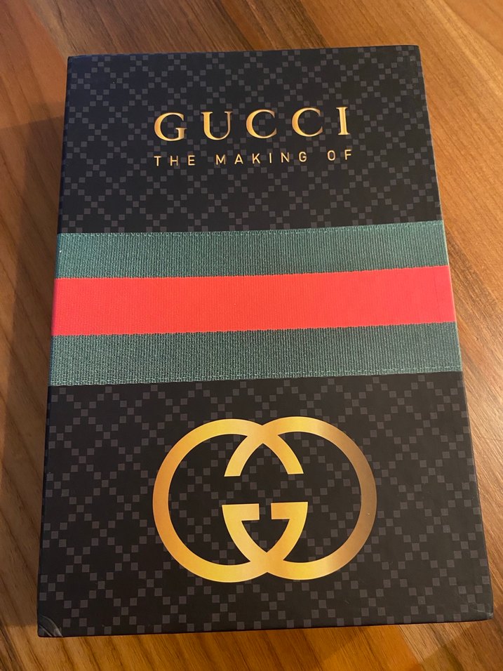 Gucci The Making Of sanat kitabı, markanın tarihini ve yaratıcı sürecini yansıtan yeşil-kırmızı şerit ve altın logo ile dikkat çekiyor.