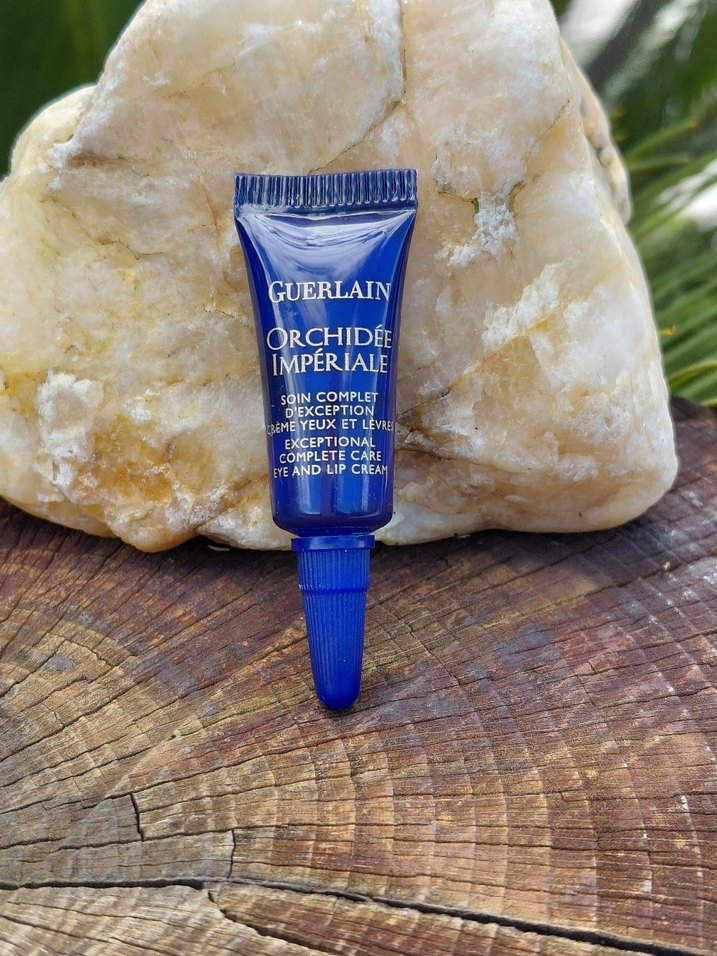 Parlak lacivert tüpte Guerlain Orchidée Impériale göz ve dudak kremi, hassas cilt için özel bakım sağlar.