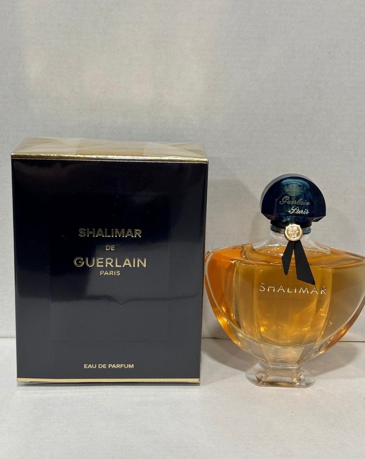 Guerlain Shalimar kadın parfümü, koyu mavi kapaklı ve şık tasarımlı klasik bir şişede sunuluyor.