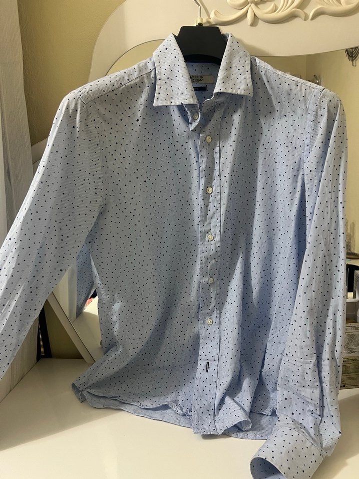 Mavi ve gri tonlarda ince desenli, pamuklu kumaştan üretilmiş, uzun kollu, düğmeli ve regular fit erkek gömlek. Ofis kullanımı için uygundur.
