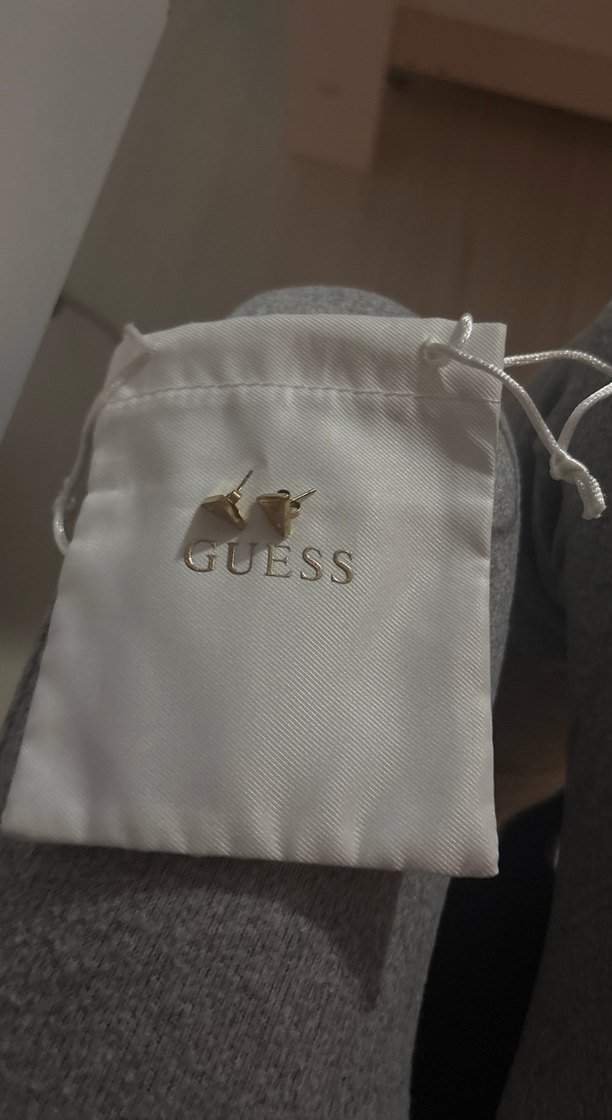 GUESS marka altın renk kadın kol düğmeleri, minimalist baskılı desenlidir. Fermuarlı torba ile gelir, düğün ve sokak stili için uygundur. ✨