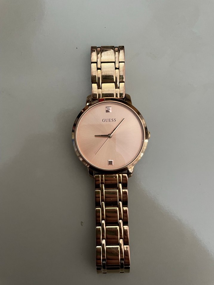Guess markalı, parlak altın renkli metal bilezik ve tokalı, minimalist yuvarlak kadranlı klasik ve modern kadın kol saati. ⌚