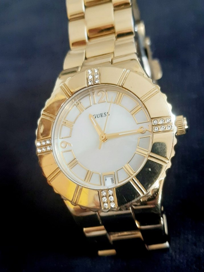 GUESS markalı bu kadın kol saati, parlak altın renkte, tokalı kayışlı ve modern klasik bir tasarıma sahiptir. Çerçevede kristal detaylar ve 6 konumunda tarih göstergesi bulunur. ⌚orjinal ve orjinal olduğu için iade alamıyorum farklı bir kutu ile gonderilecek