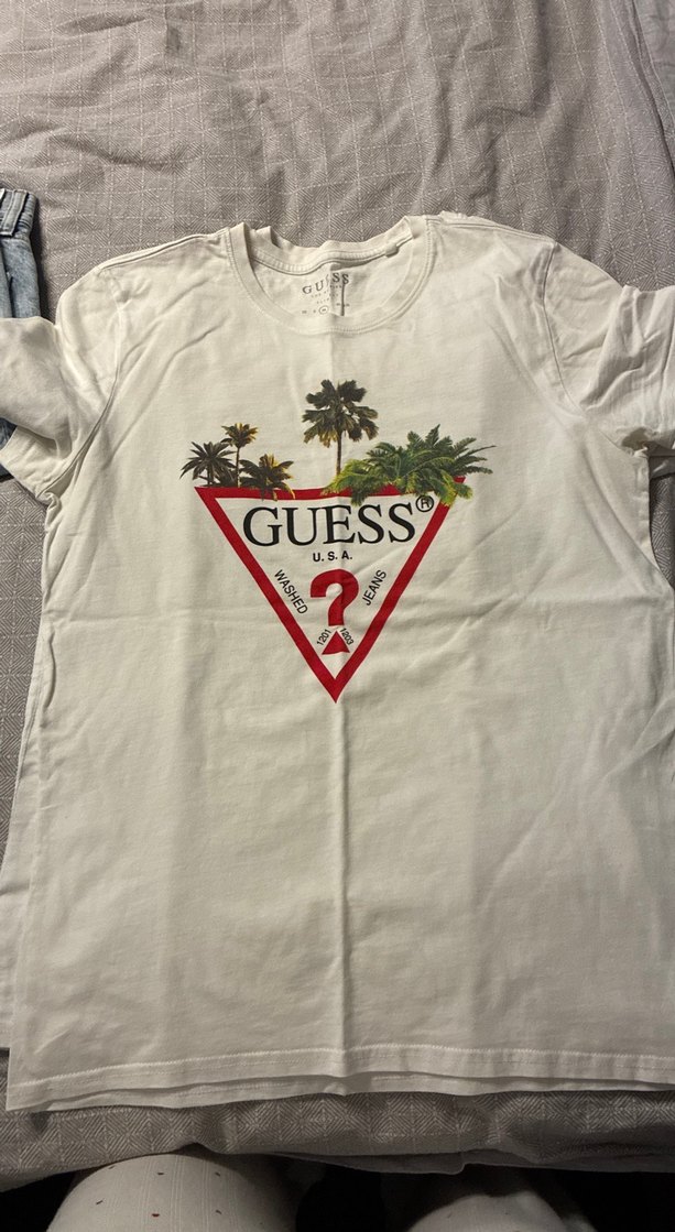 Guess marka, kısa kollu,pamuklu, slim fit beyaz tişört. Üzerinde palmiye baskısı bulunan rahat bir model.