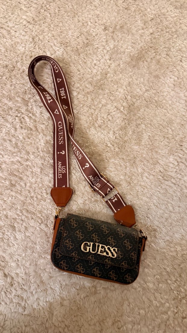 Guess marka, baskılı desenli kahverengi deri kadın çanta. Yazılı kemerli askısı ile bohem tarzına uygun, günlük sokak giyimine ideal.