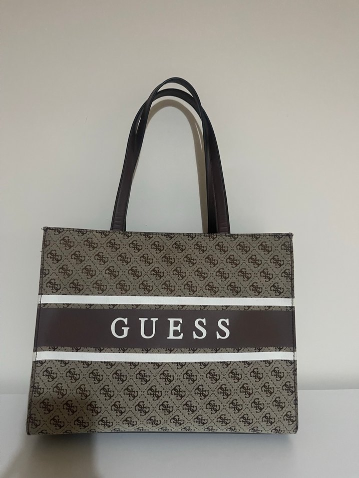 GUESS markalı, baskılı desenli, kahverengi kadın çantası. Uzun saplı ve fermuarlı, klasik sokak tarzında bir tasarım. Az kullanıldı orijinal ürün