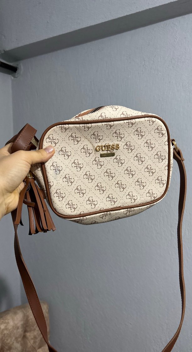 Guess markalı, bej baskılı deri çapraz çanta, gri detaylar ve püskül süslemeye sahip, günlük kullanıma uygun bohem tarzda.