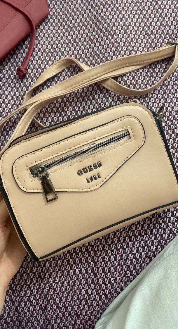 Guess markalı, fermuarlı ön cepli bej deri kadın omuz çantası. Paris tarzı, baskılı ve sokak modasına uygun günlük kullanıma ideal.