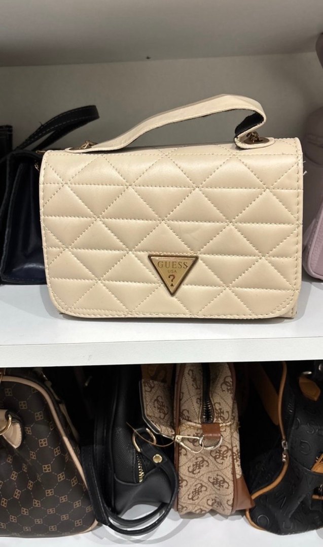 Bej renkli Guess deri çanta, kapitone deseni ve kemer detayına sahip. Günlük kullanıma uygun, trend sokak stilini tamamlar.