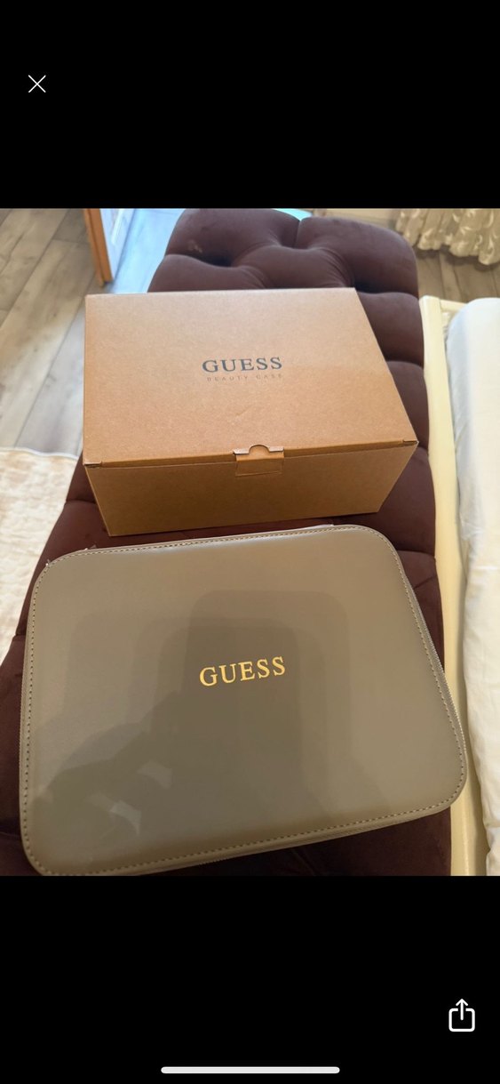 Guess markalı, parlak bej deri kadın makyaj çantası, baskılı logo ve çağdaş tasarımla günlük iş kullanımı için uygundur.