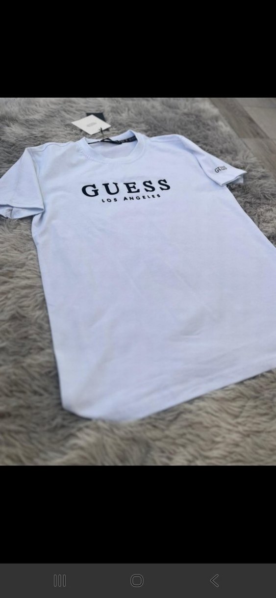 Guess marka beyaz tişört, kısa kollu ve yuvarlak yakalıdır. Pamuklu kumaştan üretilmiş, gri baskılı logo detaylarıyla günlük kullanıma uygundur.