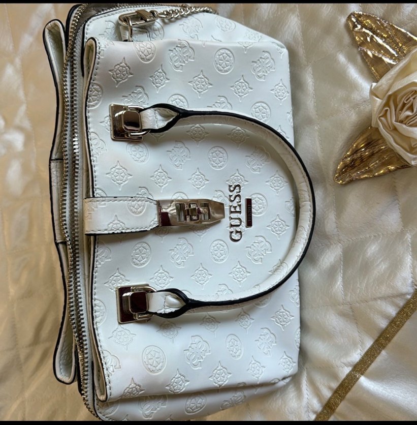 Beyaz deri Guess kadın el çantası, baskılı desen ve fermuarlı bölmeler içerir. Günlük kullanıma uygun klasik şıklık ve sokak stili bir arada.