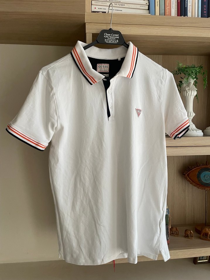 Guess markalı, pamuklu, düğmeli yakalı ve kısa kollu, beyaz renkli, baskılı detaylı, erkek slim fit polo yaka tişört. Yeni gibi hiç bir defosu. Sorunu yoktur