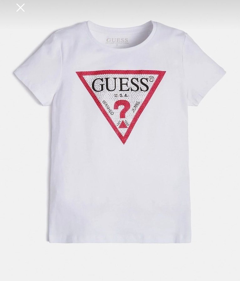 Guess markalı beyaz tişört, kısa kollu ve bisiklet yaka. Pamuklu, vücuda oturan kesim ve parlak baskılı logo detayına sahip. 16 yaş diyor ama xs uyumlu
