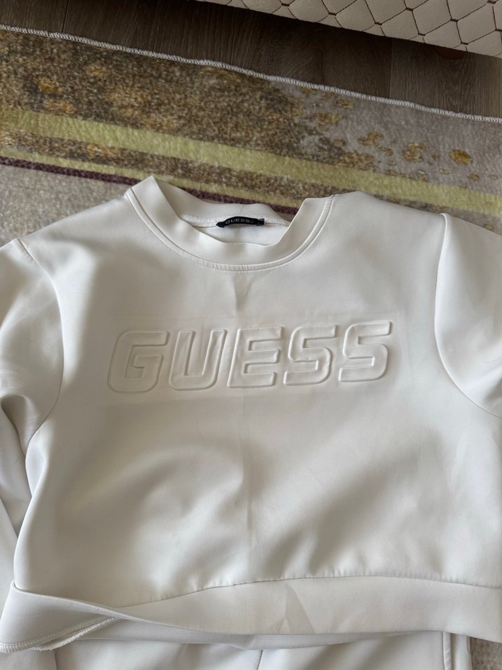 Guess markalı, yumuşak kumaştan, uzun kollu, bisiklet yaka, kısa kesim beyaz kadın sweatshirt. Önünde kabartmalı Guess logosu bulunur.