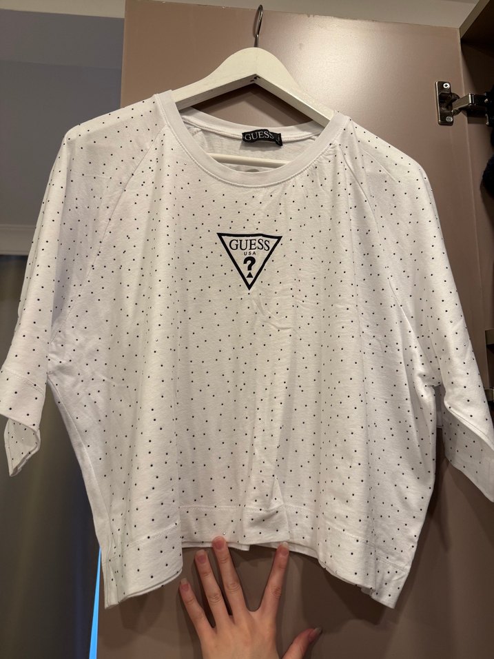 Guess markalı beyaz, kısa kollu pamuklu tişört, salaş kesim ve yuvarlak yaka. Küçük gri noktalar ve baskılı logo bulunur. Düğme detaylı, günlük kullanıma uygun.