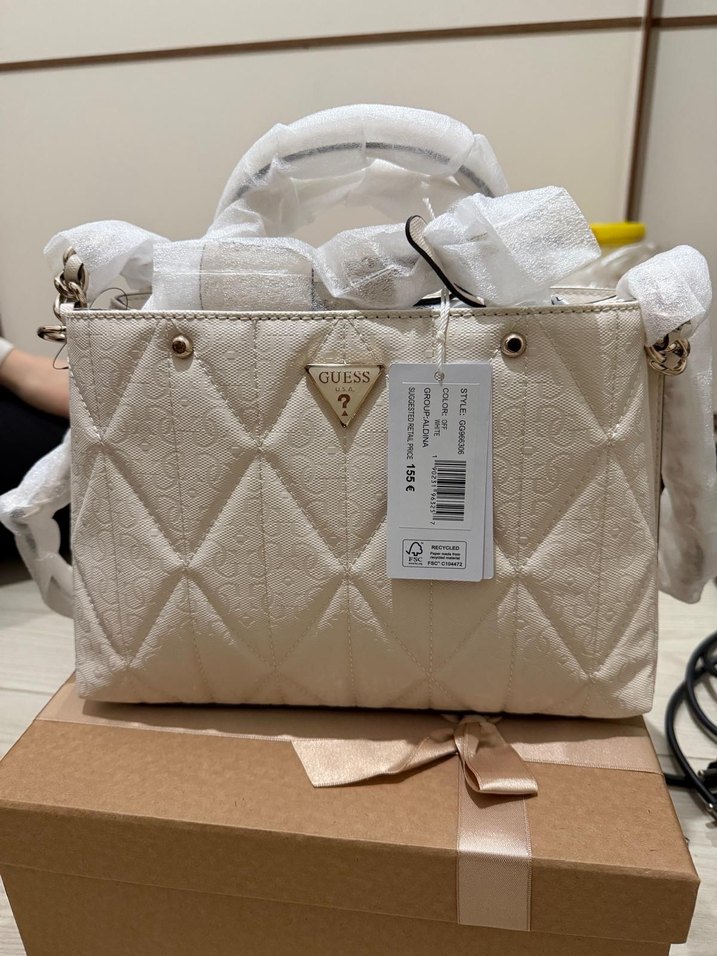 Guess beyaz kadın çanta, sentetik kumaş ve kapitone deseniyle zipli kapanışa sahiptir. Modern klasik tarzda, desen içermeyen tasarımıyla günlük kullanıma uygundur.
